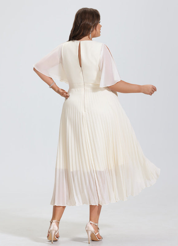 Chaque détail de cette robe a été pensé pour créer une pièce d'exception. L'ourlet asymétrique offre une silhouette dynamique et moderne, révélant subtilement les jambes à l'avant tout en conservant une longueur élégante à l'arrière, créant un effet "high-low" des plus chics. Les plis délicats, travaillés avec précision, ajoutent une texture riche et un volume aérien qui danse avec chacun de vos pas. Son col rond classique encadre délicatement le décolleté, et ses manches fluides confèrent une allure gracieuse et un confort inégalé. De plus, avec son soutien-gorge intégré, elle assure une tenue parfaite et un maintien discret, vous permettant de vous déplacer avec une aisance absolue.
