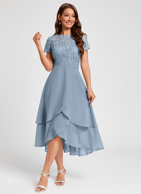 Cette Robe Jupe Asymétrique se distingue par son design réfléchi et ses détails raffinés. Le corsage présente un élégant col rond et des manches courtes, orné d'une dentelle exquise qui ajoute une touche de sophistication. La taille est subtilement marquée, menant à une jupe trapèze en mousseline de soie, dont la coupe asymétrique (plus courte à l'avant, plus longue à l'arrière) crée un mouvement dynamique et une silhouette incroyablement flatteuse. Le dos arrondi apporte une finition élégante, et pour votre confort absolu, un soutien-gorge intégré assure un maintien parfait sans nécessiter de sous-vêtements supplémentaires. C'est la fusion parfaite entre un style audacieux et une élégance intemporelle.
